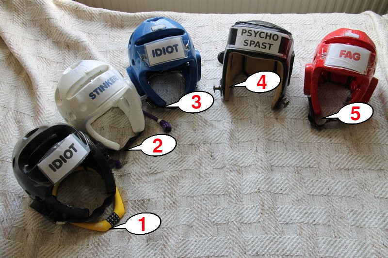 Der Deppenhelm ist DAS Markenzeichen des Deppen. Duch seine grossformatigen- von weitem lesbaren „Typenschilder“ macht es den Idioten für alle erkennbar als das, was er ist – ein Depp, Idiot, Stinker, …. Eigentlich ist der Deppenhelm ein Kickbox-Schutzhelm auf dessen Stirn eine Klarsichttasche angebracht ist, in die man die verschiedenen Typenschilder einstecken kann – ganz nach Wunsch des Dom. Darüber hinaus sind die Helme so modifiziert, dass man sie abschliessen und so gegen Ausziehen sichern kann. Bei längerem tragen fängt der Depp darunter fürchterlich an zu schwitzen. Ausserdem pressen die Helme den Kopf zusammen, was dem Idioten nach einigen Stunden echt unangenehm wird. Als längstes „dufte“ der Idiot einen Deppenhelm 14-Tage, Tag und Nacht tragen…