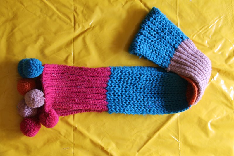 Bunte Strickmütze mit passenden Handschuhen. Das Besondere: An alle Teile sind Ketten genäht, so dass sie gegen Ausziehen gesichert werdn können und der Clou: an alle Teile sind Glöckchen genäht. So ist der Depp überall zu hören und kann sich nicht davon schleichen.