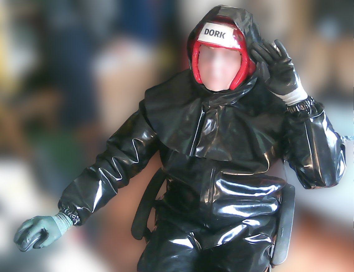 Dieser schwere PVC-Anzug (1000g/m2) von rainwear.store (PA-28) ist das Flagschiff der Erniedrigungsoutfits. Er ist nicht nur sehr schwer und besonders luftdicht, sondern auch extrem warm. Im Winter noch auszuhalten, wird das tragen im Sommer eine echte Tortur. Wenn es gemein werden soll, passt noch gut ein Skianzug drunter.