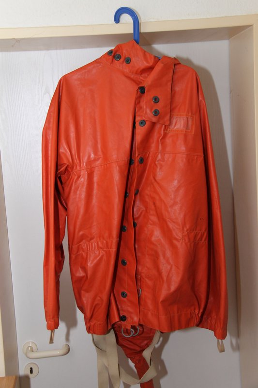 Ein schwerer, gefütterter Winter-Bau-Regenanzug (PA-006) gehört als Standard zum Deppenoutfit dazu. Er ist weit genug, dass er über mehrere Schichten anderer Klamotten getragen werden kann, er ist sehr warm und er fällt ordentlich auf – was will Dom mehr…