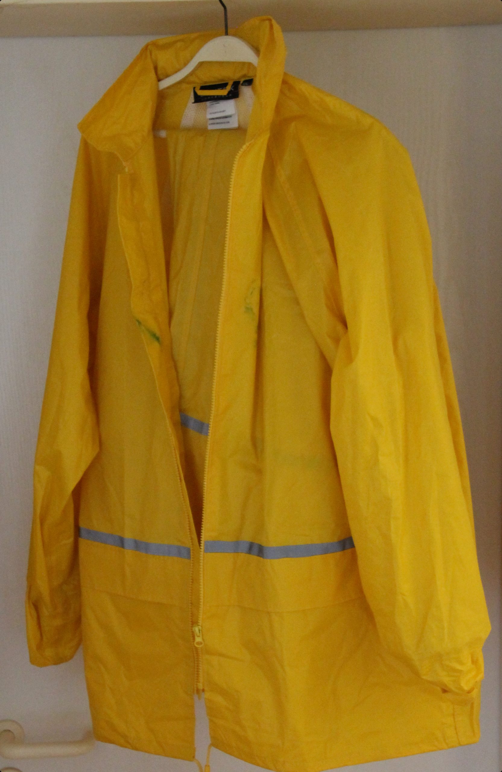 Der gelbe Nylon-Regenanzug (PA-003) hat eine im Kragen verstaute Kapuze und daher wunderbar auch als Unterwäsche unter fast allen Outfits geeignet. Das Material lässt unmittelbar den Schweiss in Strömen fliessen. Auch als einfacher „Hausanzug“ in Verbindung mit Gummistiefeln und Deppenhelm kann dieser Anzug eingesetzt werden. Zumindest für Besuch und den Postboten im Hochsommer ein Hingucker. Dieser Anzug ist auch in Orange (PA-004) verfügbar [ohne Bild].