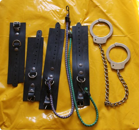 Die Handmanschetten (FT-001) und Fussmanschetten (FT-002) sind aus Gummi und lassen sich von viel Schweiss nicht beeindrucken. Die klassischen Fußschellen (FT-003) sind massiv, können aber nicht eingesetzt werden, wenn der Depp Gummistiefel trägt.