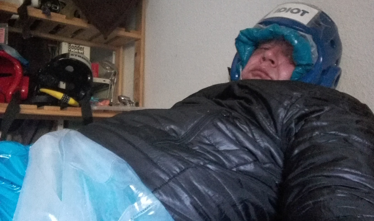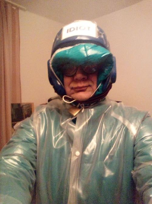 Ich konnte immerhin aushandeln, dass ich für die Nacht „nur“ den blauen Glanznylon-Skioverall, den Klarsicht, PVC-Mantel, Deppenhelm und 3 Paar Gummihandschuhe anziehen musste. Natürlich wollte der Boss davon ein Foto haben. Für den kommenden Morgen kündigte SIR Augustin-FAG mir an, dass ich die 10-Schichten PVC und Nylon anzuziehen hätte. Dann wünschte er mir eine gute Nacht, nicht ohne mir zu sagen, was für ein dummer Depp ich sei und dass ich bestimmt gut stinken würde.