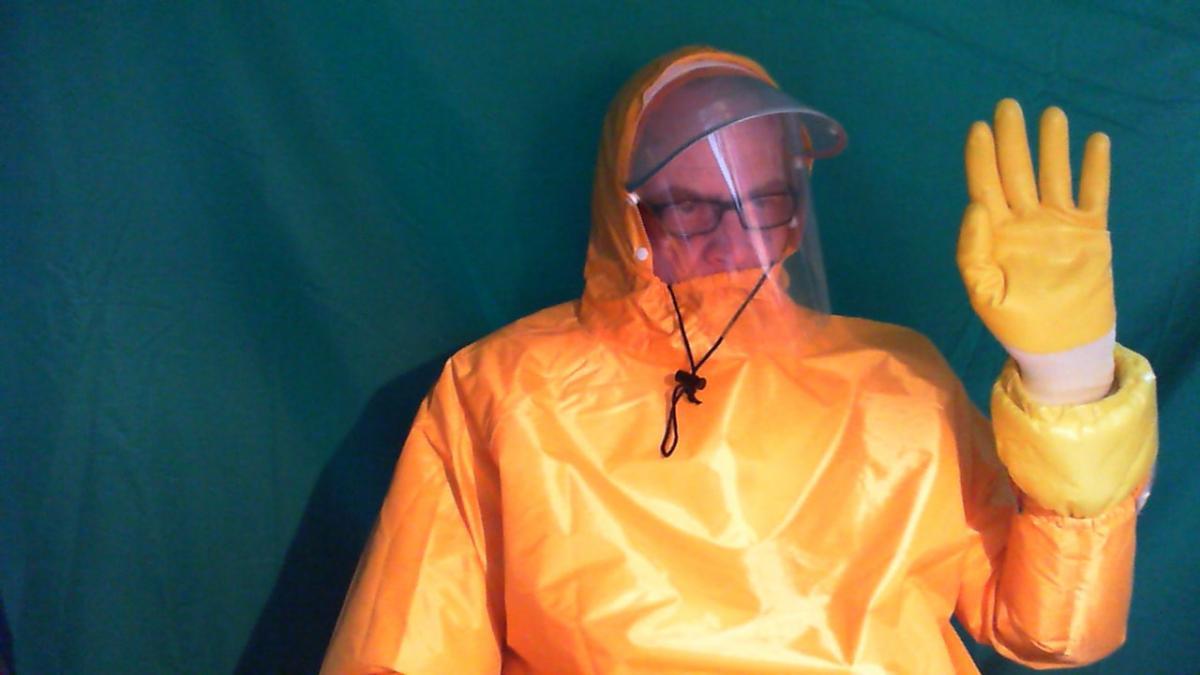 Der Depp muss einen Idioten-Schutzanzug tragen, um andere nicht zu infizieren