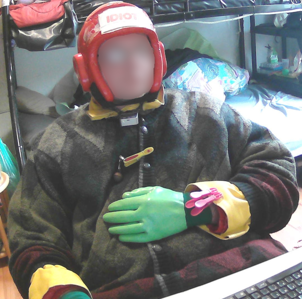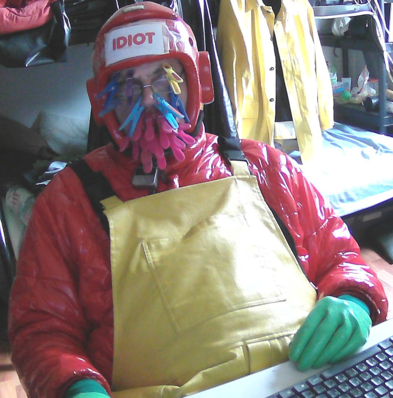 Ich Depp trage schon morgens seit 08:00 Uhr KG, Plug, 5 Windeln, Schneeanzug, Bau-Regenlatzhose, Idioten-Helm, Gummistiefel und Gummihandschuhe.