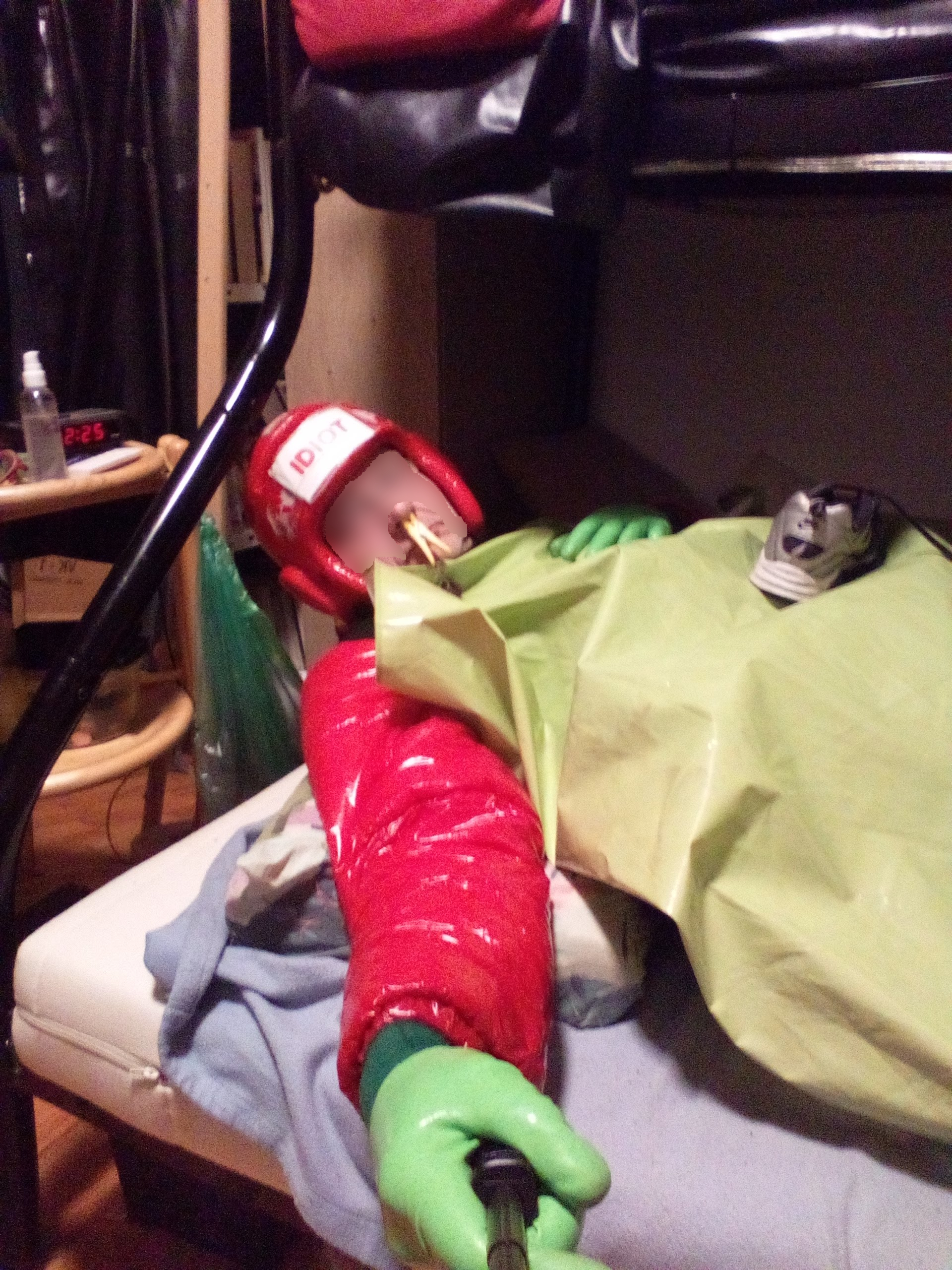 Sir Dennis: „Ab heute trägst Du die nächste Woche jede Nacht Plug, 2 Windeln, Wollstrumpfhose, Wollpullover, PVC-Regenanzug, Schneeanzug, Helm, Gummistiefel und Gummihandschuhe. Du schläfst unter Winter-Bettwäsche + Wolldeck + PVC-Decke.“