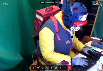 Orja hat 2 Skianzüge und PVC an und darf so den Tag verbringen. Dazu muss er Strafarbeit machen und dies live ins Netz übertragen.